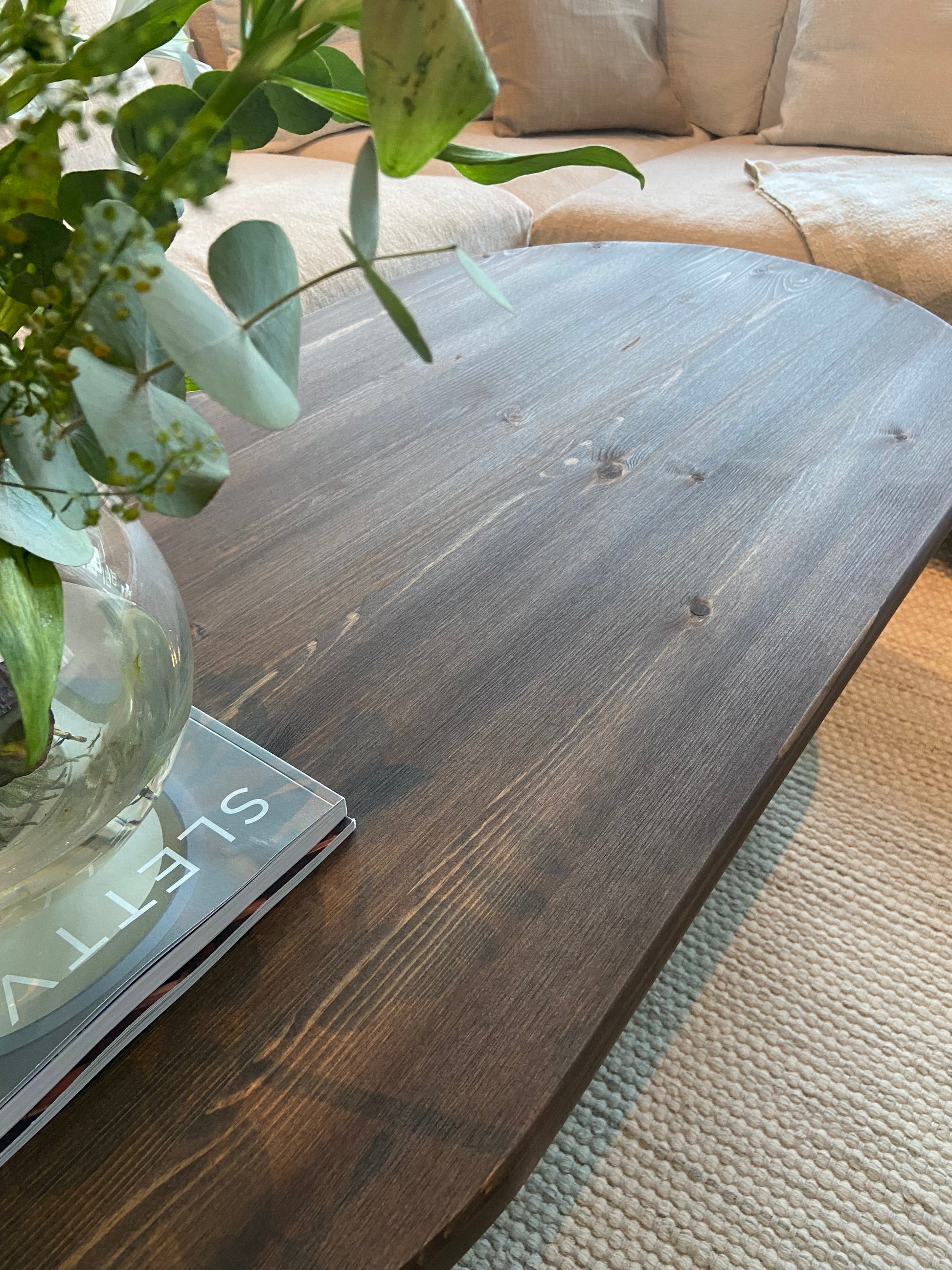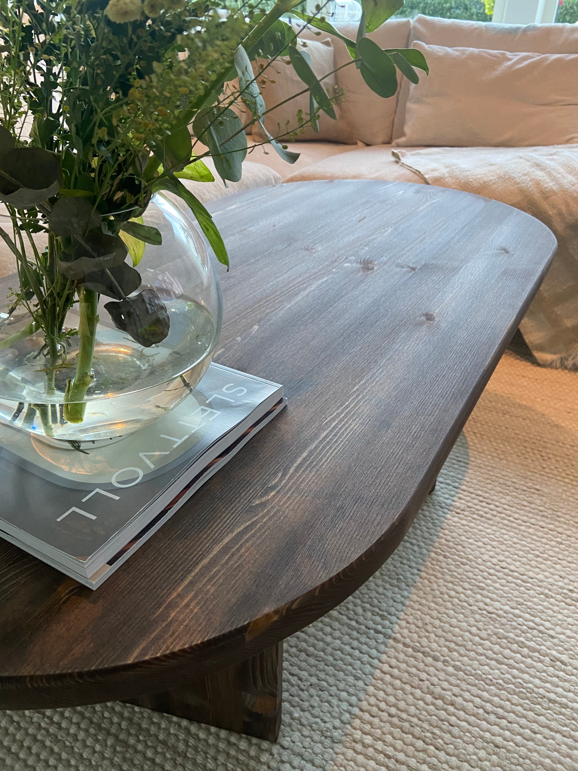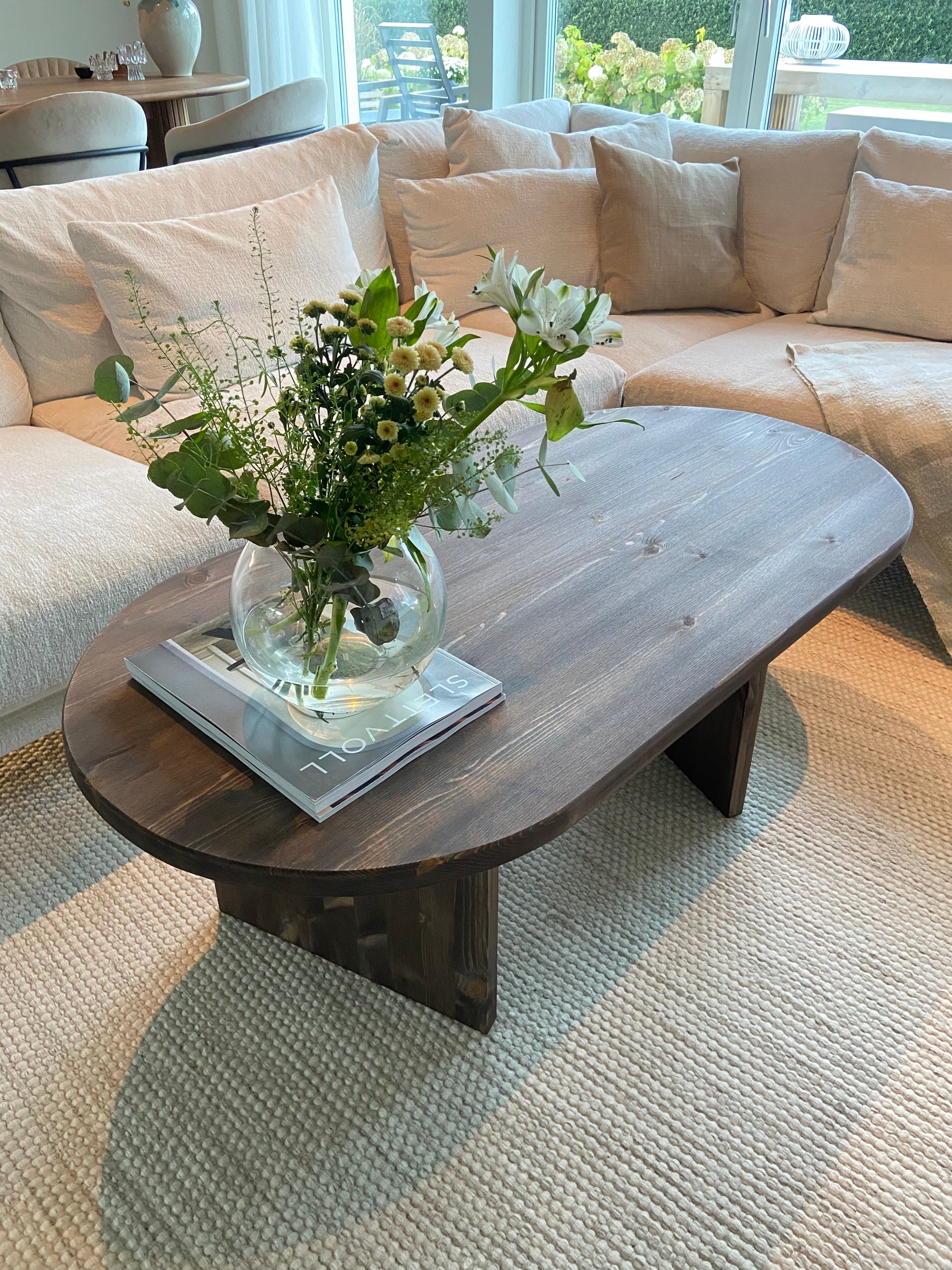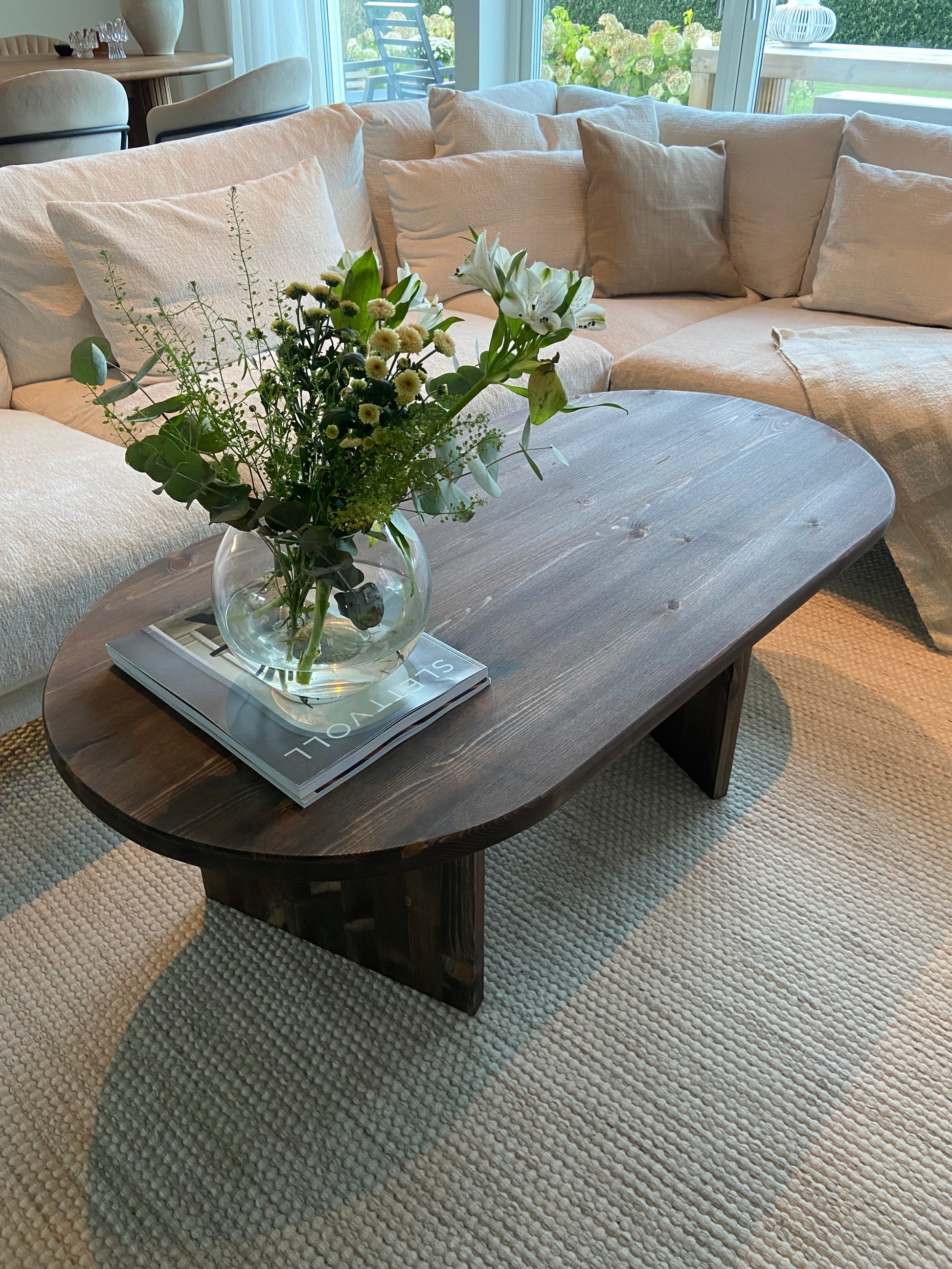 Ovalt soffbord i massiv stavlimmad furu, 2,8 mm tjock, med en elegant lackad yta.